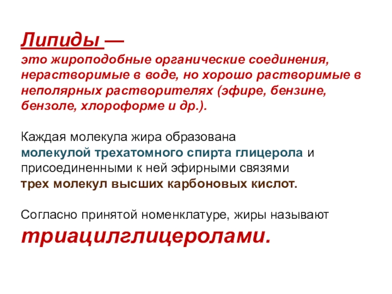 это жироподобные органические соединения, нерастворимые в воде, но хорошо растворимые