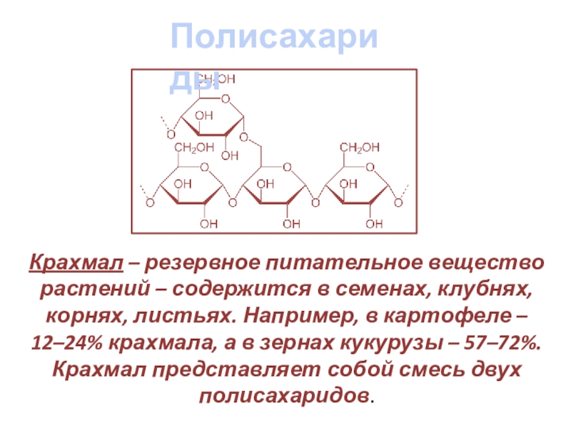 корнях, листьях. Например, в картофеле – 12–24% крахмала, а в зернах кукурузы – 57–72%.