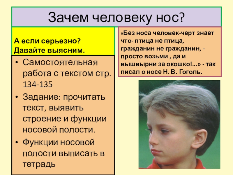 «Без носа человек-черт знает что- птица не птица, гражданин не гражданин, - просто возьми , да и вышвырни за окошко!...» - так писал о носе Н. В. Гоголь.