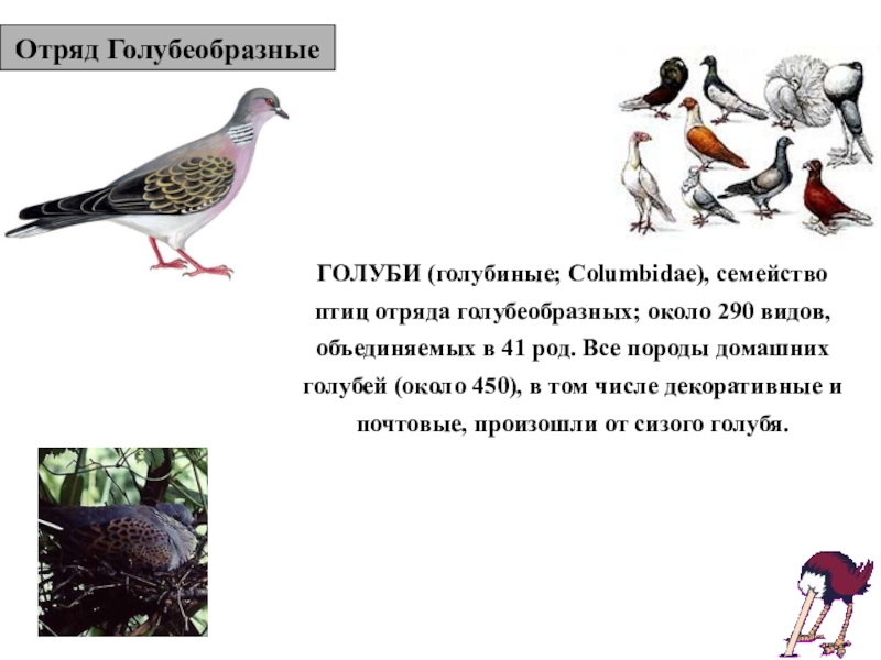 видов, объединяемых в 41 род. Все породы домашних голубей (около 450), в том числе декоративные и почтовые, произошли от сизого голубя.