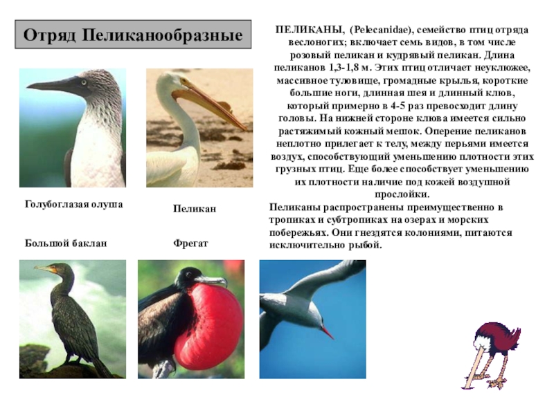 птиц отряда веслоногих; включает семь видов, в том числе розовый пеликан и кудрявый пеликан. Длина пеликанов 1,3-1,8 м. Этих птиц отличает неуклюжее, массивное туловище, громадные крылья, короткие большие ноги, длинная шея и длинный клюв, который примерно в 4-5 раз превосходит длину головы. На нижней стороне клюва имеется сильно растяжимый кожный мешок. Оперение пеликанов неплотно прилегает к телу, между перьями имеется воздух, способствующий уменьшению плотности этих грузных птиц. Еще более способствует уменьшению их плотности наличие под кожей воздушной прослойки.