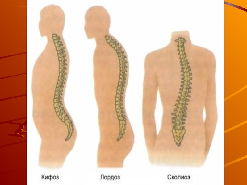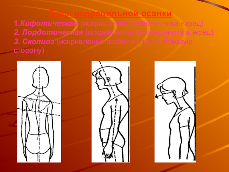Типы неправильной осанки 1.Кифотическая (искривление позвоночника назад) 2. Лордотическая (искривление позвоночника вперед) 3. Сколиоз (искривление позвоночника в боковую сторону)