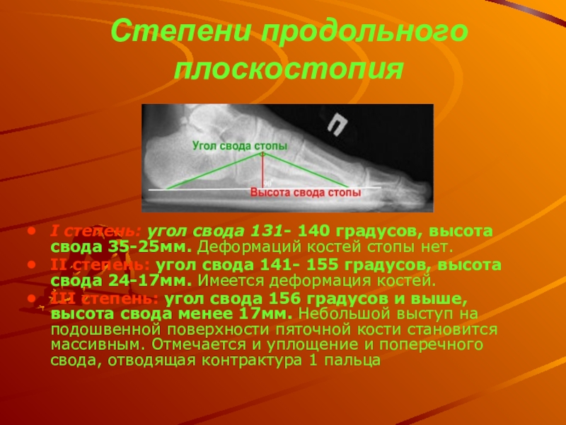 Степени продольного плоскостопияI степень: угол свода 131- 140 градусов, высота свода 35-25мм. Деформаций костей стопы нет.II степень: