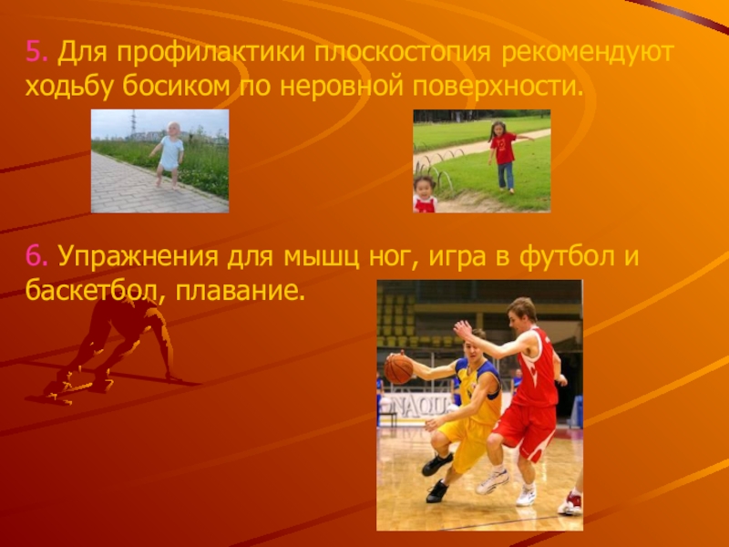 5. Для профилактики плоскостопия рекомендуют ходьбу босиком по неровной поверхности.6. Упражнения для мышц ног, игра в футбол