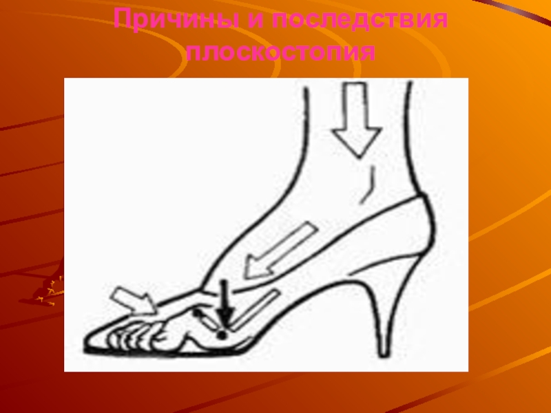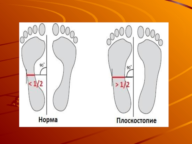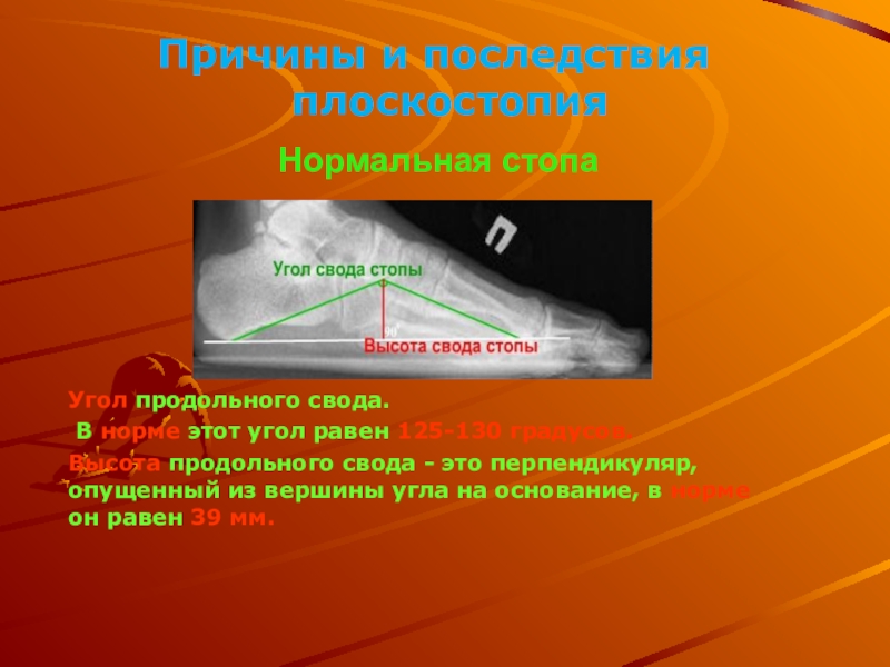 Нормальная стопаПричины и последствия плоскостопияУгол продольного свода. В норме этот угол равен 125-130 градусов. Высота продольного свода