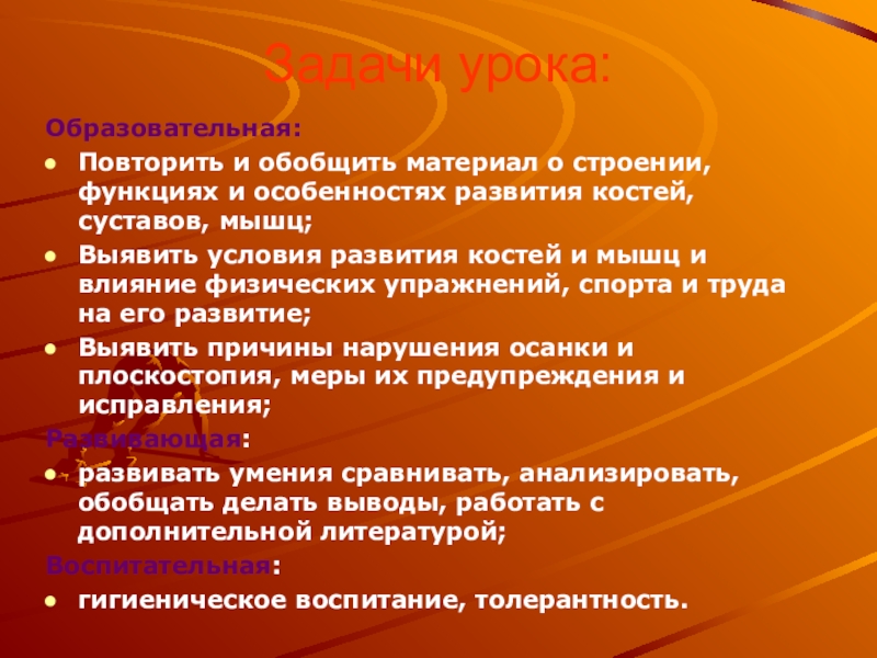 Задачи урока:Образовательная:Повторить и обобщить материал о строении, функциях и особенностях развития костей, суставов, мышц;Выявить условия развития костей
