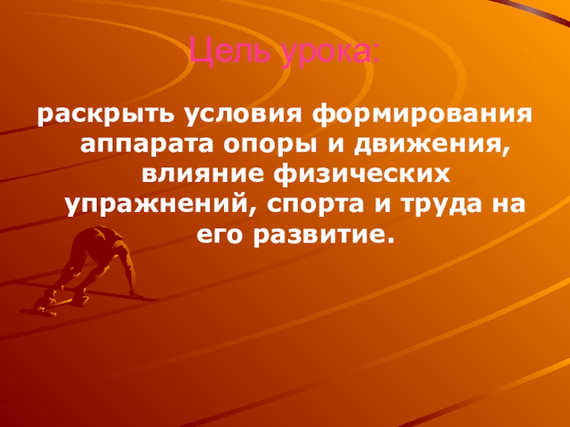 Цель урока:раскрыть условия формирования аппарата опоры и движения, влияние физических упражнений, спорта и труда на его развитие.