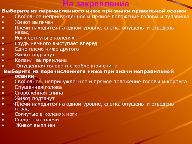 На закреплениеВыберите из перечисленного ниже при знаки правильной осанкиСвободное непринужденное и прямое положение головы и туловищаЖивот выпяченПлечи
