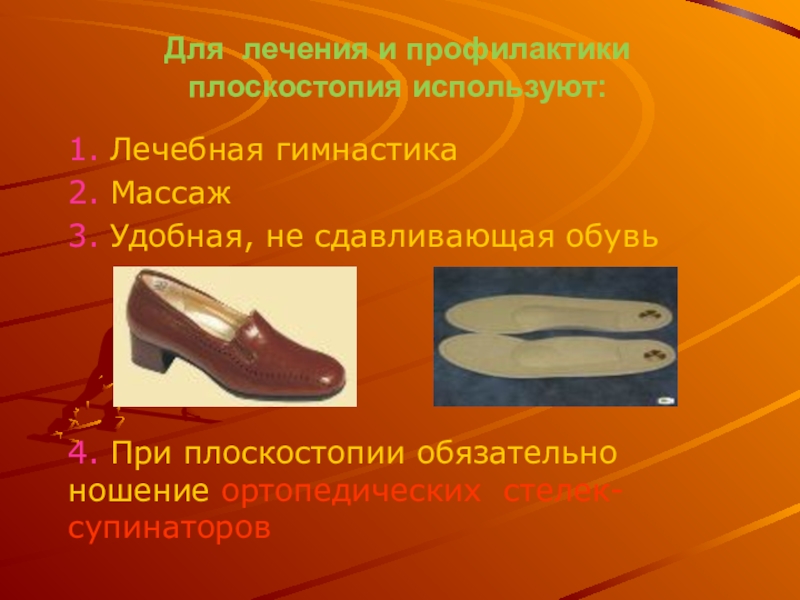 4. При плоскостопии обязательно ношение ортопедических стелек-супинаторов