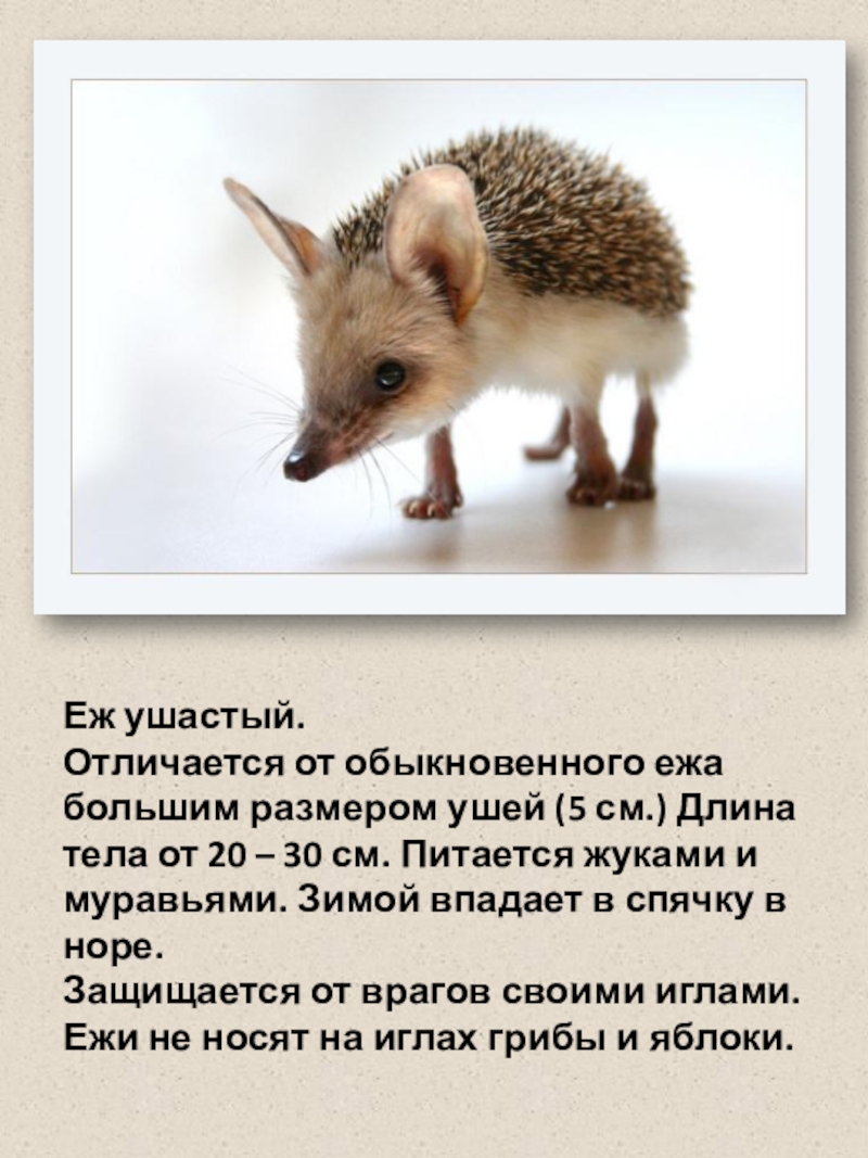 Отличается от обыкновенного ежа большим размером ушей (5 см.) Длина