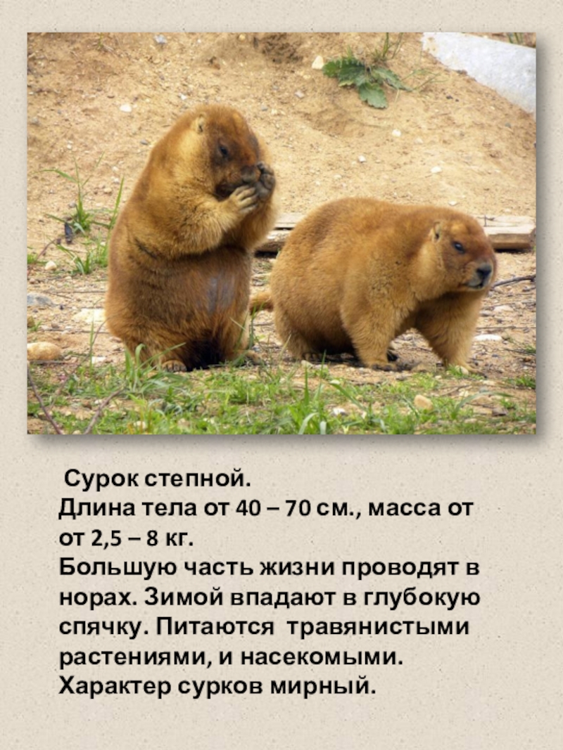 Большую часть жизни проводят в норах. Зимой впадают в глубокую спячку. Питаются травянистыми растениями, и насекомыми. Характер сурков мирный.