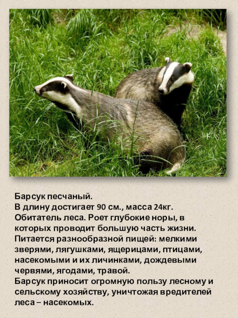 Барсук приносит огромную пользу лесному и сельскому хозяйству, уничтожая вредителей леса – насекомых.