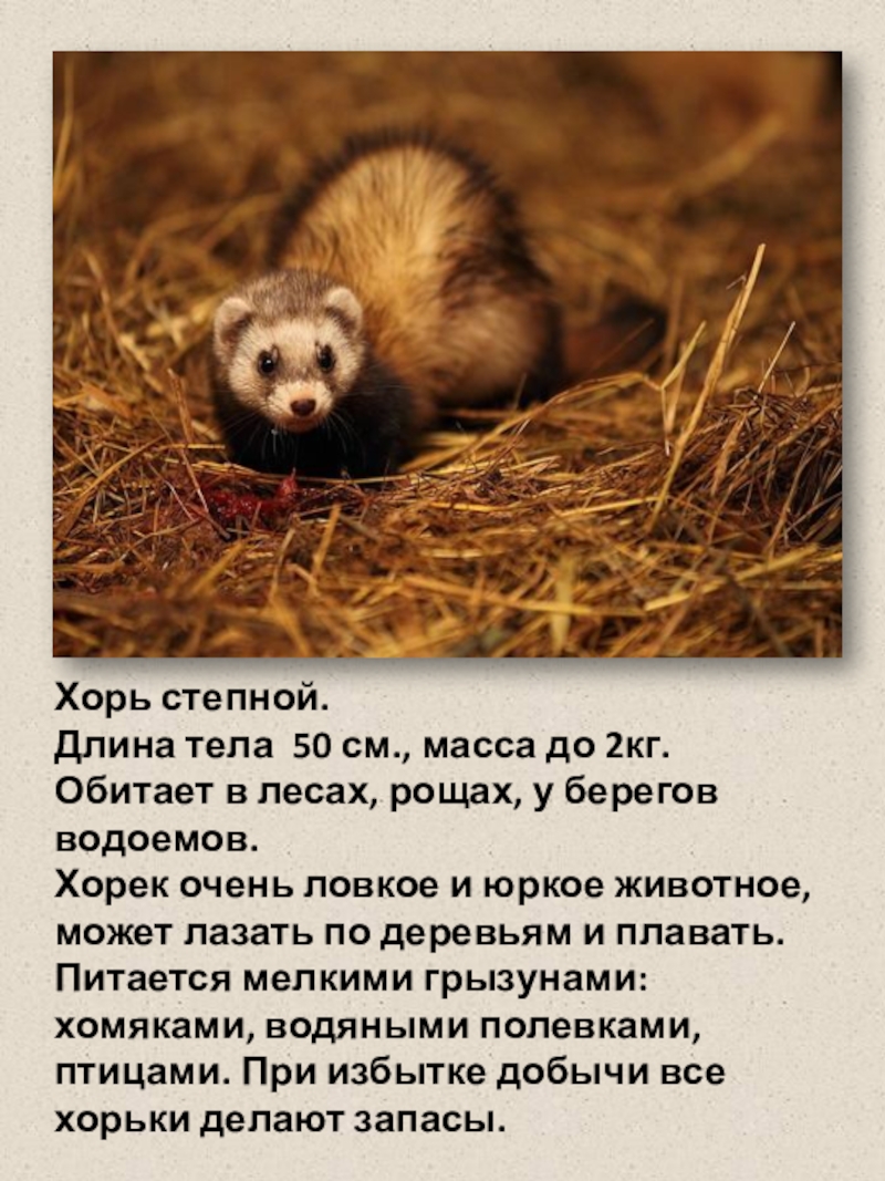 Хорек очень ловкое и юркое животное, может лазать по деревьям и плавать.