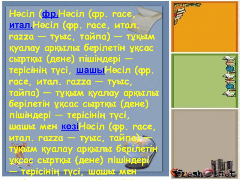 тайпа) — тұқым қуалау арқылы берілетін ұқсас сыртқы (дене) пішіндері — терісінің түсі, шашыНәсіл (фр. race, итал. razza — туыс, тайпа) — тұқым қуалау арқылы берілетін ұқсас сыртқы (дене) пішіндері — терісінің түсі, шашы мен көзіНәсіл (фр. race, итал. razza — туыс, тайпа) — тұқым қуалау арқылы берілетін ұқсас сыртқы (дене) пішіндері — терісінің түсі, шашы мен көзі, мұрны мен еріндерінің пішіні, бойы мен дене пропорциясы, сондай-ақ кейбір "жасырын" белгілері (қанының тобы және т.б.) бар адамдардың тарихи қалыптасқан тобы.