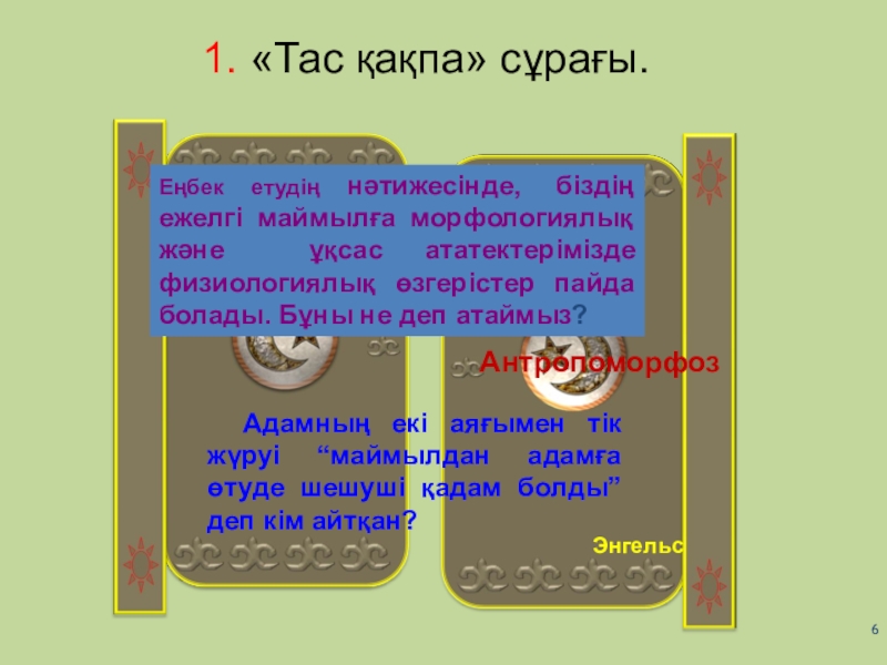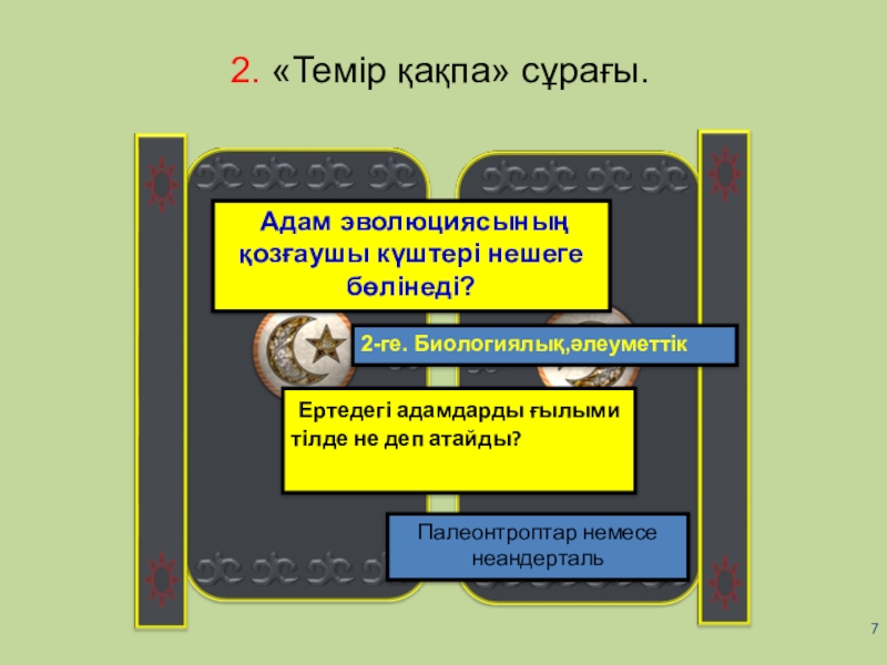Отты қолдана білу; 3. Қарапайым еңбек құралдарын дайындай алу; 4. Табындасып өмір сүру түрі; 5. От тұтата білу; 6. Питекантроптар; 7. Неандартальдықтар;