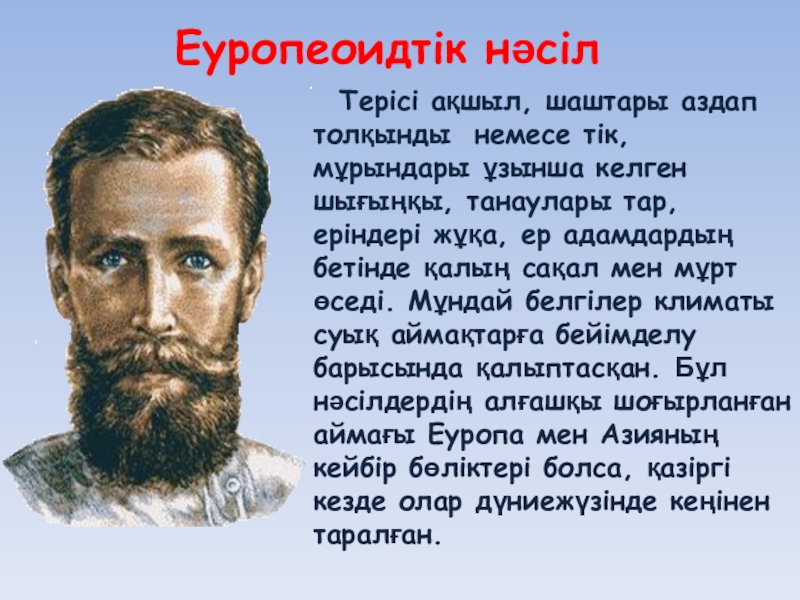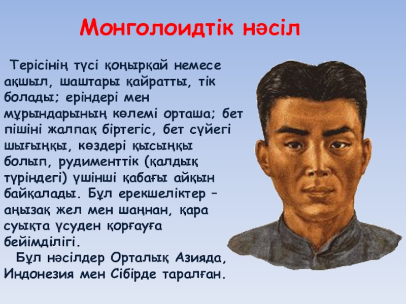 Слайд 18 Терісі ақшыл, шаштары аздап толқынды немесе тік, мұрындары ұзынша