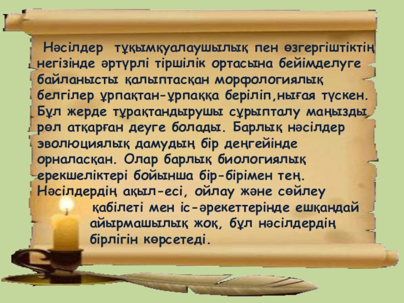 Слайд 23 Нәсілдер тұқымқуалаушылық пен өзгергіштіктің негізінде әртүрлі тіршілік ортасына бейімделуге байланысты