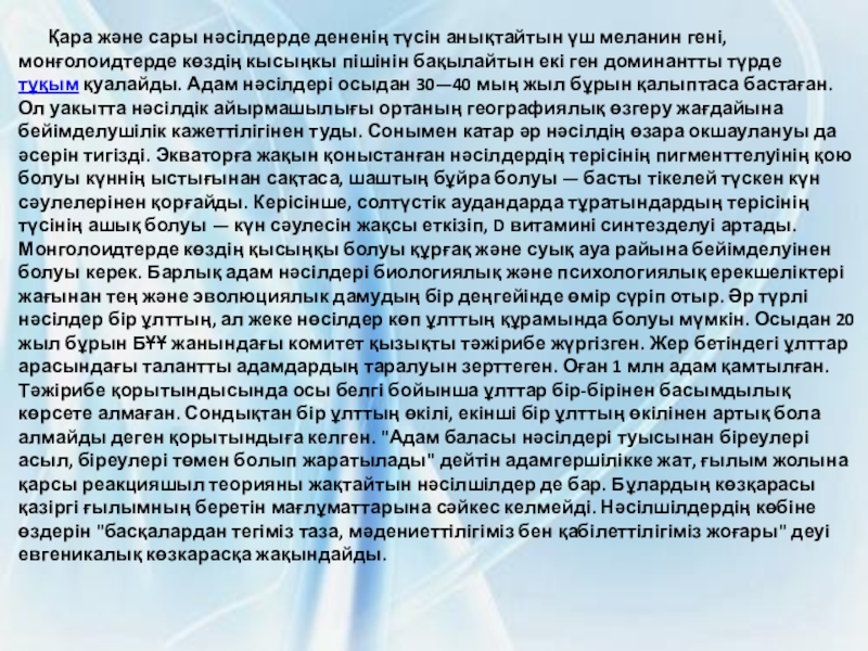 тұқым қуалайды. Адам нәсілдері осыдан 30—40 мың жыл бұрын қалыптаса бастаған. Ол уакытта нәсілдік айырмашылығы ортаның географиялық өзгеру жағдайына бейімделушілік кажеттілігінен туды. Сонымен катар әр нәсілдің өзара окшаулануы да әсерін тигізді. Экваторға жақын қоныстанған нәсілдердің терісінің пигменттелуінің қою болуы күннің ыстығынан сақтаса, шаштың бұйра болуы — басты тікелей түскен күн сәулелерінен қорғайды. Керісінше, солтүстік аудандарда тұратындардың терісінің түсінің ашық болуы — күн сәулесін жақсы еткізіп, D витамині синтезделуі артады. Монголоидтерде көздің қысыңқы болуы құрғақ және суық ауа райына бейімделуінен болуы керек. Барлық адам нәсілдері биологиялық және психологиялық ерекшеліктері жағынан тең және эволюциялык дамудың бір деңгейінде өмір сүріп отыр. Әр түрлі нәсілдер бір ұлттың, ал жеке нөсілдер көп ұлттың құрамында болуы мүмкін. Осыдан 20 жыл бұрын БҰҰ жанындағы комитет қызықты тәжірибе жүргізген. Жер бетіндегі ұлттар арасындағы талантты адамдардың таралуын зерттеген. Оған 1 млн адам қамтылған. Тәжірибе қорытындысында осы белгі бойынша ұлттар бір-бірінен басымдылық көрсете алмаған. Сондықтан бір ұлттың өкілі, екінші бір ұлттың өкілінен артық бола алмайды деген қорытындыға келген. "Адам баласы нәсілдері туысынан біреулері асыл, біреулері төмен болып жаратылады" дейтін адамгершілікке жат, ғылым жолына қарсы реакцияшыл теорияны жақтайтын нәсілшілдер де бар. Бұлардың көзқарасы қазіргі ғылымның беретін мағлұматтарына сәйкес келмейді. Нәсілшілдердің көбіне өздерін "басқалардан тегіміз таза, мәдениеттілігіміз бен қабілеттілігіміз жоғары" деуі евгеникалық көзкарасқа жақындайды.