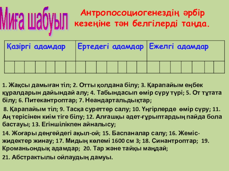 Слайд 4Антропосоциогенездің әрбір кезеңіне тән белгілерді таңда.