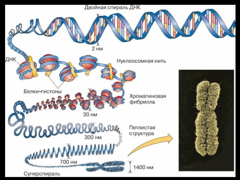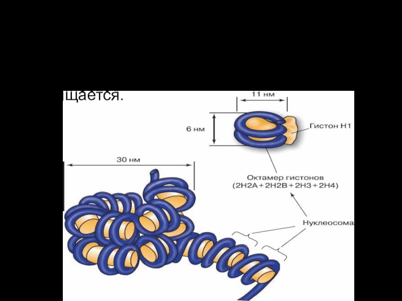 Соединяясь с белками — гистонами, молекула еще сильнее спирализуется,