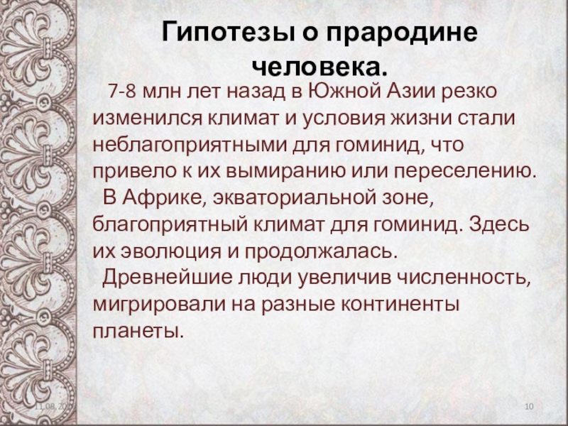 Гипотезы о прародине человека.  7-8 млн лет назад в Южной Азии резко изменился климат и условия