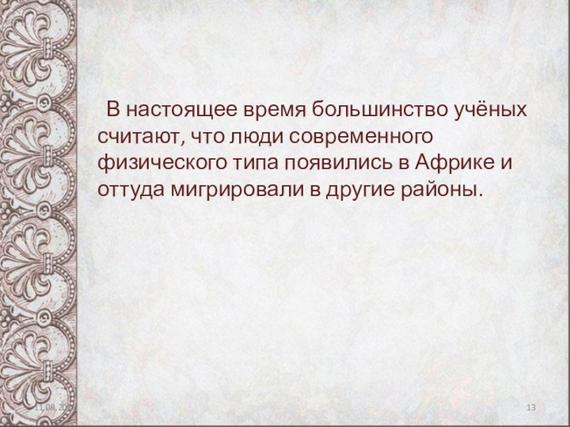 Слайд 13 В настоящее время большинство учёных считают, что люди современного физического