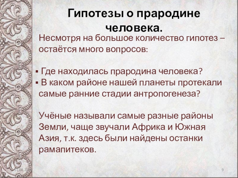 Гипотезы о прародине человека.Несмотря на большое количество гипотез – остаётся много вопросов: Где находилась прародина человека? В