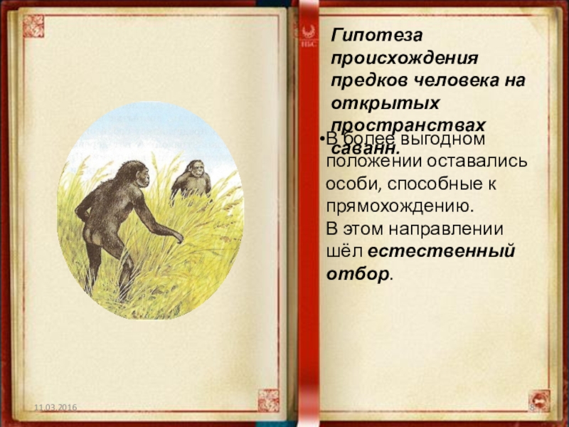 Гипотеза происхождения предков человека на открытых пространствах саванн.В более выгодном положении оставались особи, способные к прямохождению.В этом