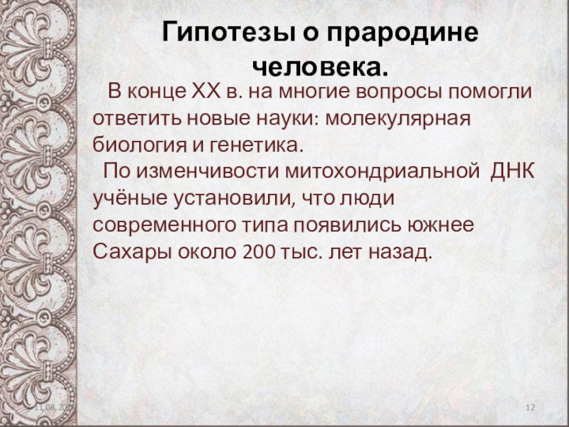 Гипотезы о прародине человека.  В конце ХХ в. на многие вопросы помогли ответить новые науки: молекулярная