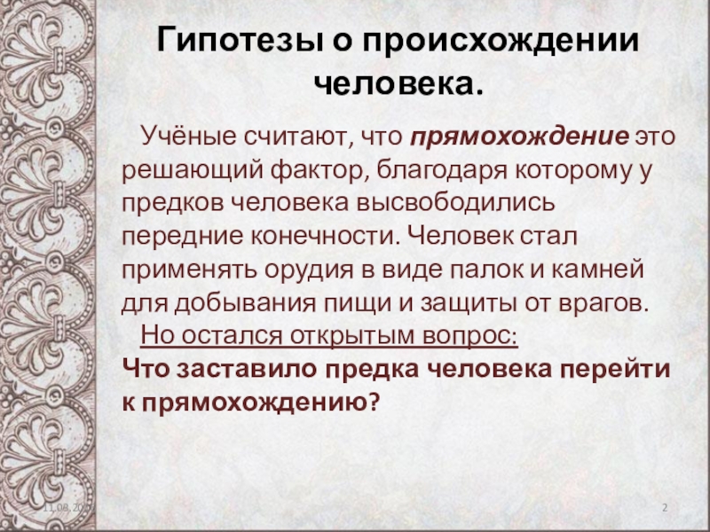 Гипотезы о происхождении человека. Учёные считают, что прямохождение это решающий фактор, благодаря которому у предков человека высвободились передние конечности. Человек стал применять орудия в виде палок и камней для добывания пищи и защиты от врагов.