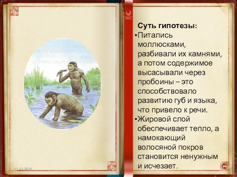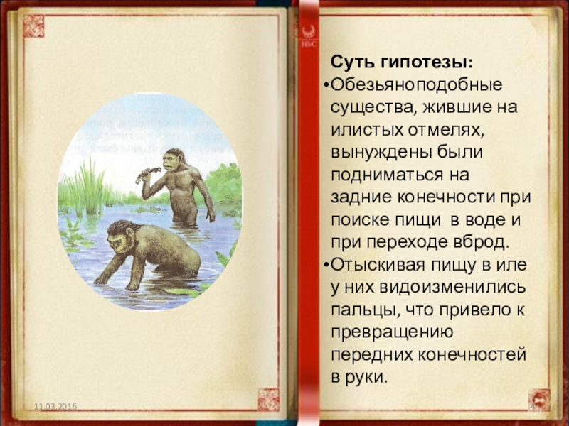 Суть гипотезы:Обезьяноподобные существа, жившие на илистых отмелях, вынуждены были подниматься на задние конечности при поиске пищи в