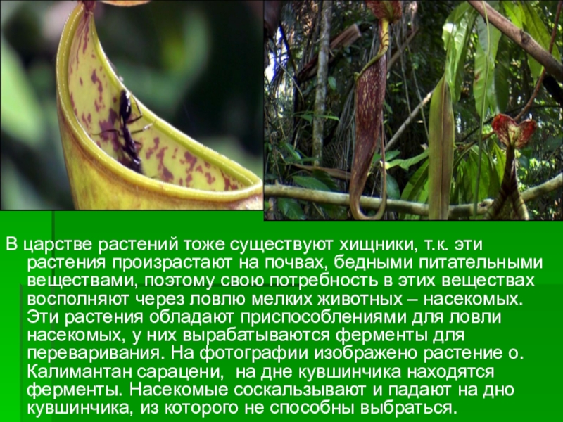 почвах, бедными питательными веществами, поэтому свою потребность в этих веществах восполняют через ловлю мелких животных – насекомых. Эти растения обладают приспособлениями для ловли насекомых, у них вырабатываются ферменты для переваривания. На фотографии изображено растение о.Калимантан сарацени, на дне кувшинчика находятся ферменты. Насекомые соскальзывают и падают на дно кувшинчика, из которого не способны выбраться.