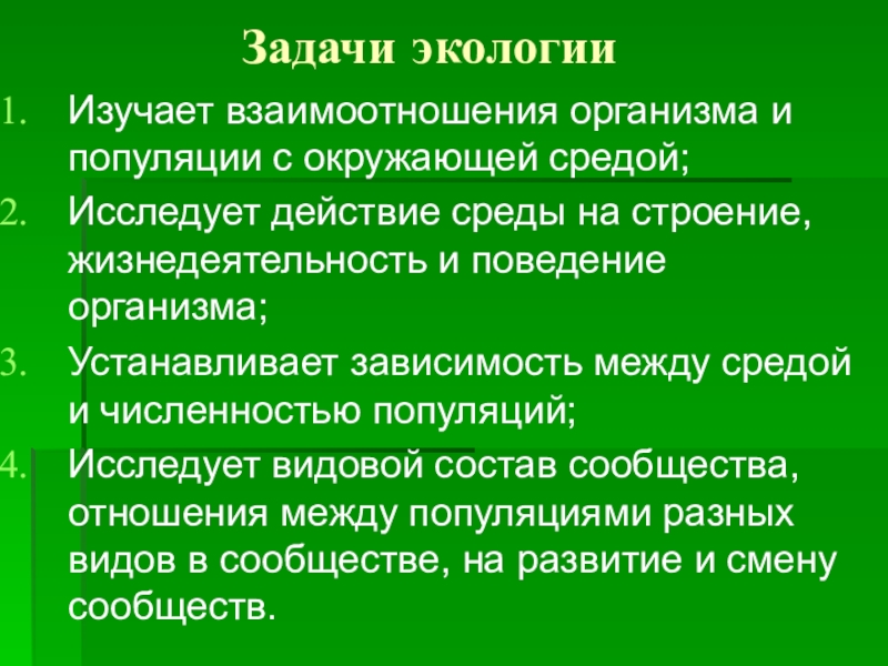 Задачи экологииИзучает взаимоотношения организма и популяции с окружающей средой;Исследует действие среды на строение, жизнедеятельность и поведение организма;Устанавливает
