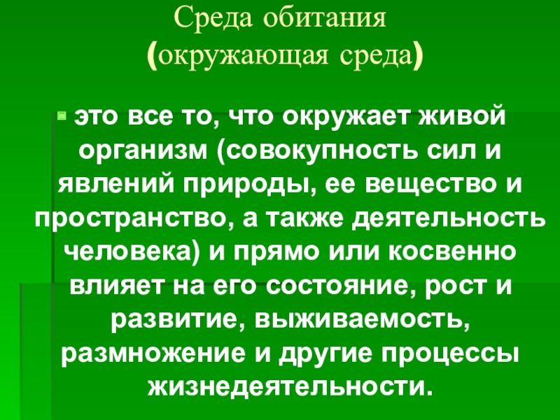 сил и явлений природы, ее вещество и пространство, а также деятельность человека) и прямо или косвенно влияет на его состояние, рост и развитие, выживаемость, размножение и другие процессы жизнедеятельности.