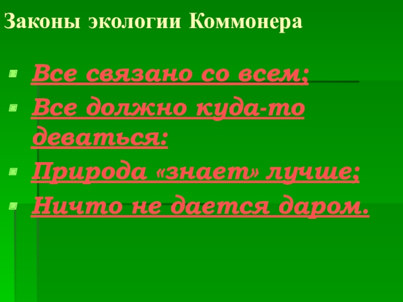 Законы экологии КоммонераВсе связано со всем;Все должно куда-то деваться:Природа «знает» лучше;Ничто не дается даром.