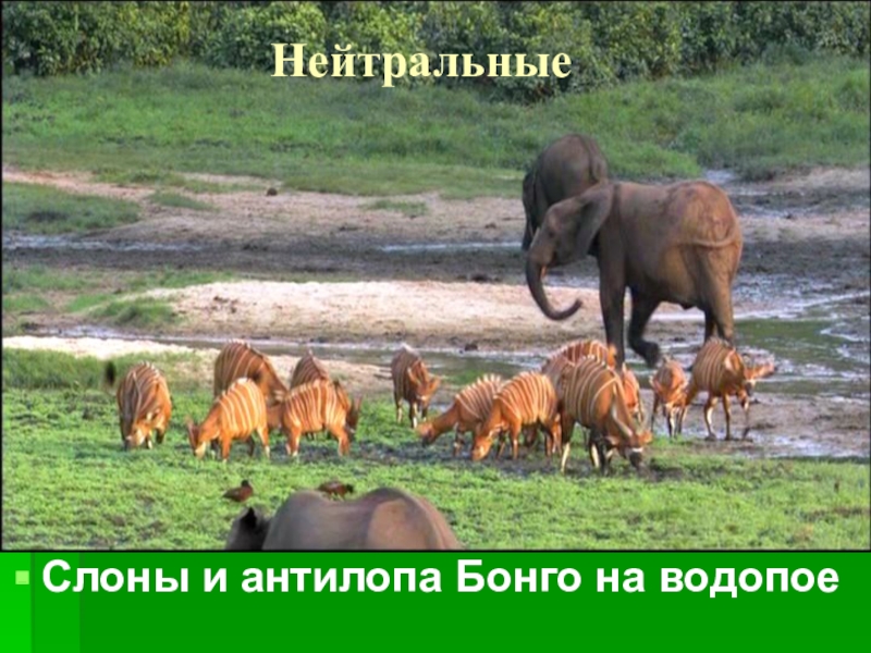 Нейтральные Слоны и антилопа Бонго на водопое