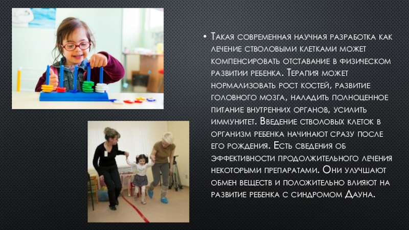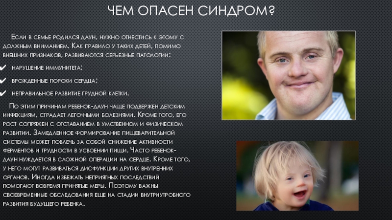 По этим причинам ребенок-даун чаще подвержен детским инфекциям, страдает легочными болезнями. Кроме того, его рост сопряжен с отставанием в умственном и физическом развитии. Замедленное формирование пищеварительной системы может повлечь за собой снижение активности ферментов и трудности в усвоении пищи. Часто ребенок-даун нуждается в сложной операции на сердце. Кроме того, у него могут развиваться дисфункции других внутренних органов. Иногда избежать неприятных последствий помогают вовремя принятые меры. Поэтому важны своевременные обследования еще на стадии внутриутробного развития будущего ребенка.