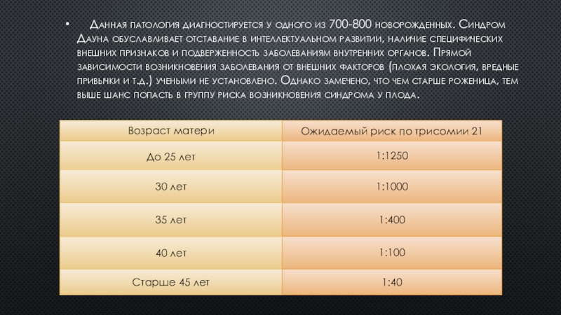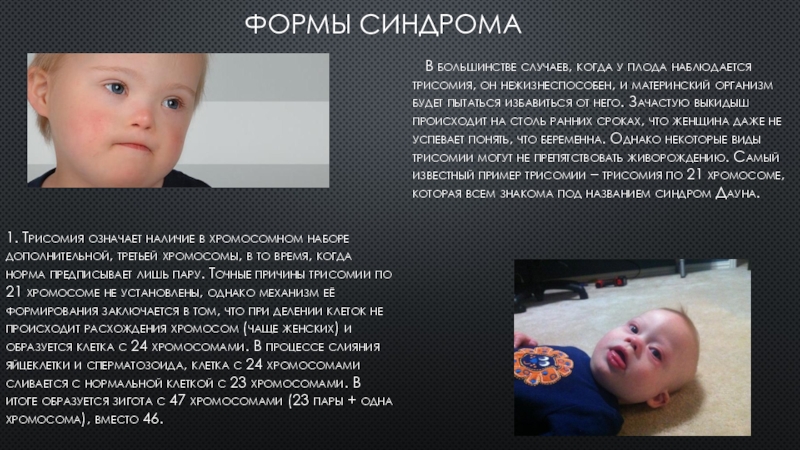 В большинстве случаев, когда у плода наблюдается трисомия, он нежизнеспособен, и материнский организм будет пытаться избавиться от него. Зачастую выкидыш происходит на столь ранних сроках, что женщина даже не успевает понять, что беременна. Однако некоторые виды трисомии могут не препятствовать живорождению. Самый известный пример трисомии – трисомия по 21 хромосоме, которая всем знакома под названием синдром Дауна.