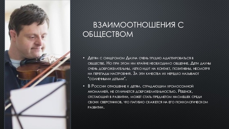 Однако люди с синдромом Дауна могут вести полноценную жизнь. Они способны к обучению, несмотря на то, что этот процесс протекает у них гораздо медленнее. Среди таких людей есть много талантливых актеров, для которых в 1999 был создан Театр Простодушных в Москве.