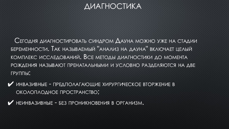 Сегодня диагностировать синдром Дауна можно уже на стадии беременности. Так называемый "анализ на дауна" включает целый комплекс исследований. Все методы диагностики до момента рождения называют пренатальными и условно разделяются на две группы: