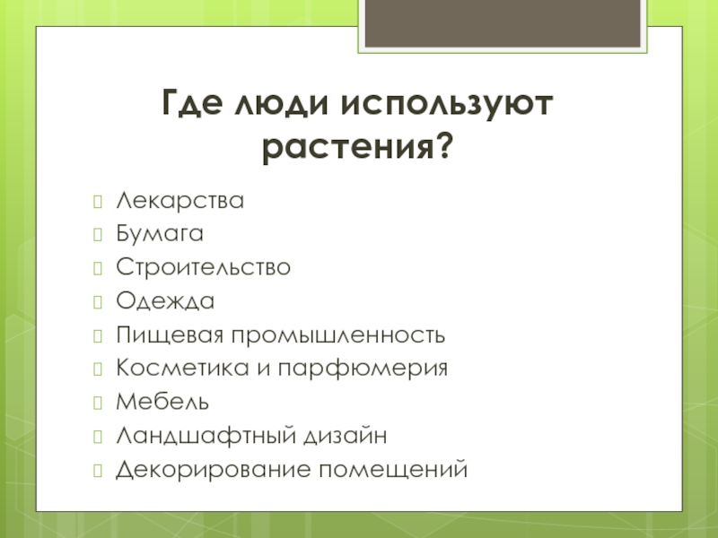 Где люди используют растения?ЛекарстваБумагаСтроительствоОдеждаПищевая промышленностьКосметика и парфюмерияМебельЛандшафтный дизайнДекорирование помещений