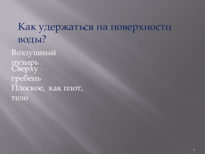 Как удержаться на поверхности воды?Воздушный пузырьСверху - гребеньПлоское, как плот, тело