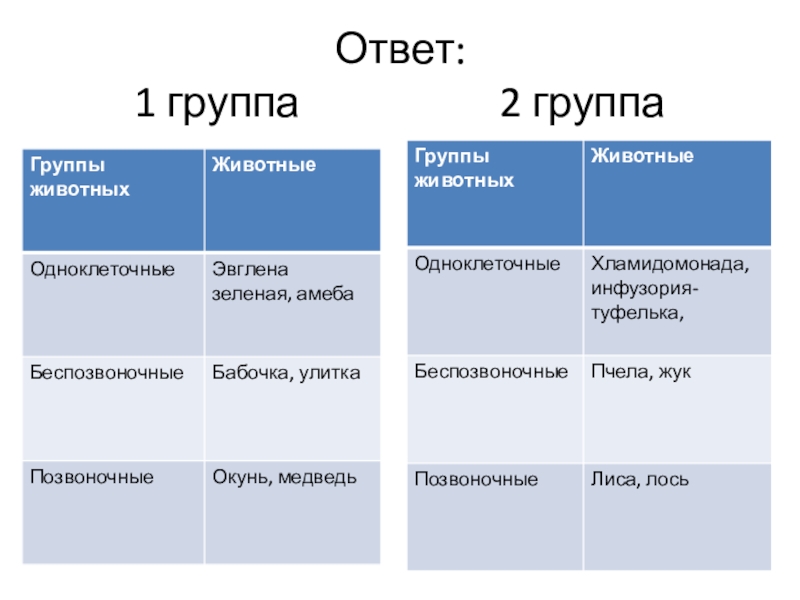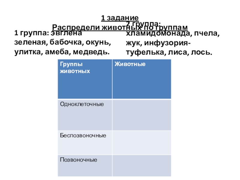 2 группа: хламидомонада, пчела, жук, инфузория-туфелька, лиса, лось.