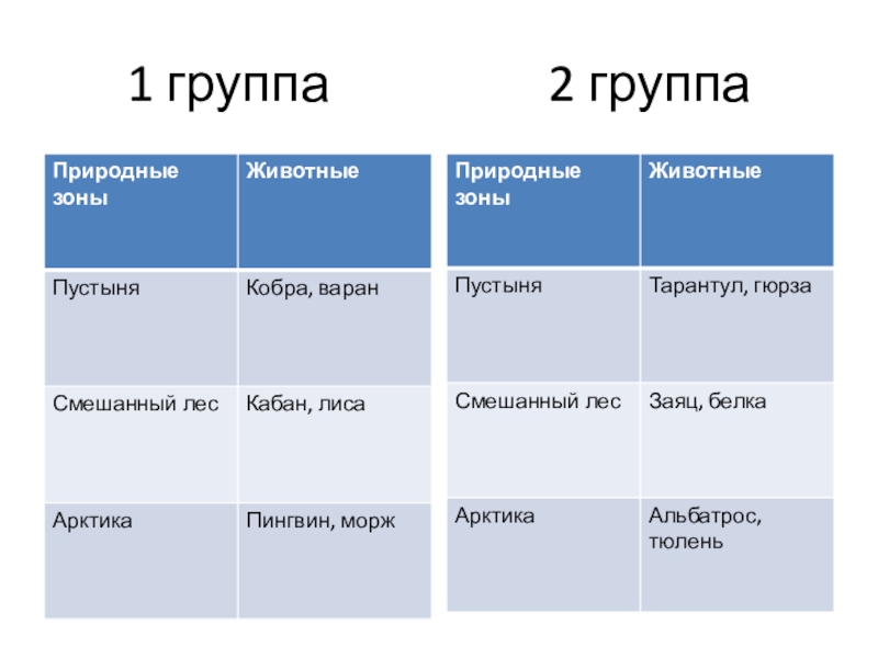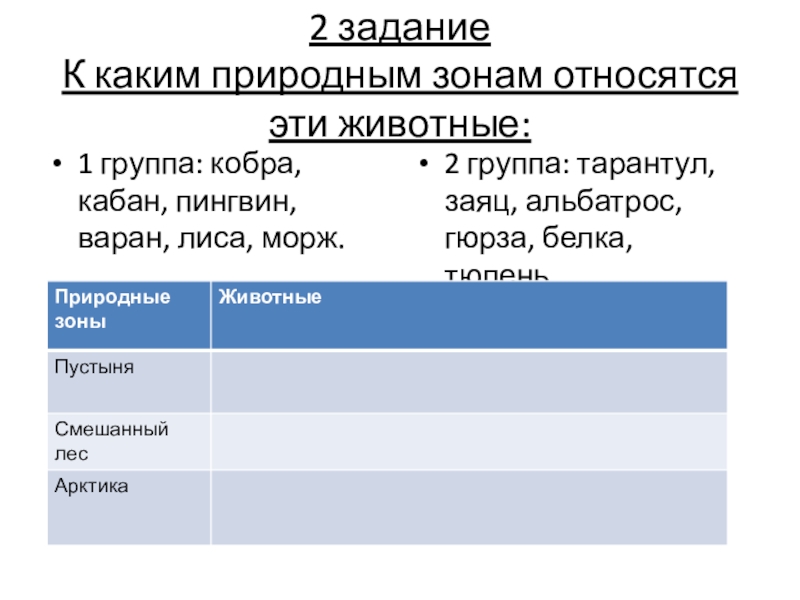 2 группа: тарантул, заяц, альбатрос, гюрза, белка, тюлень.