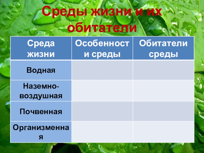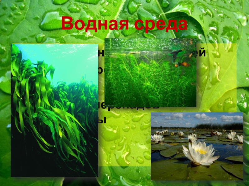 Водная средаНаличие минеральных солейМало кислородаМало светаНет резких перепадов температуры