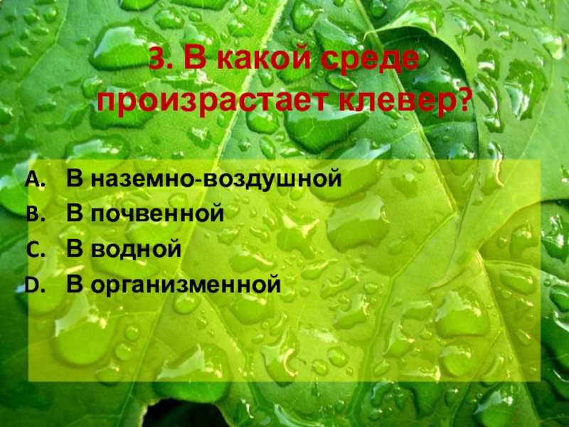 3. В какой среде произрастает клевер?В наземно-воздушнойВ почвеннойВ воднойВ организменной