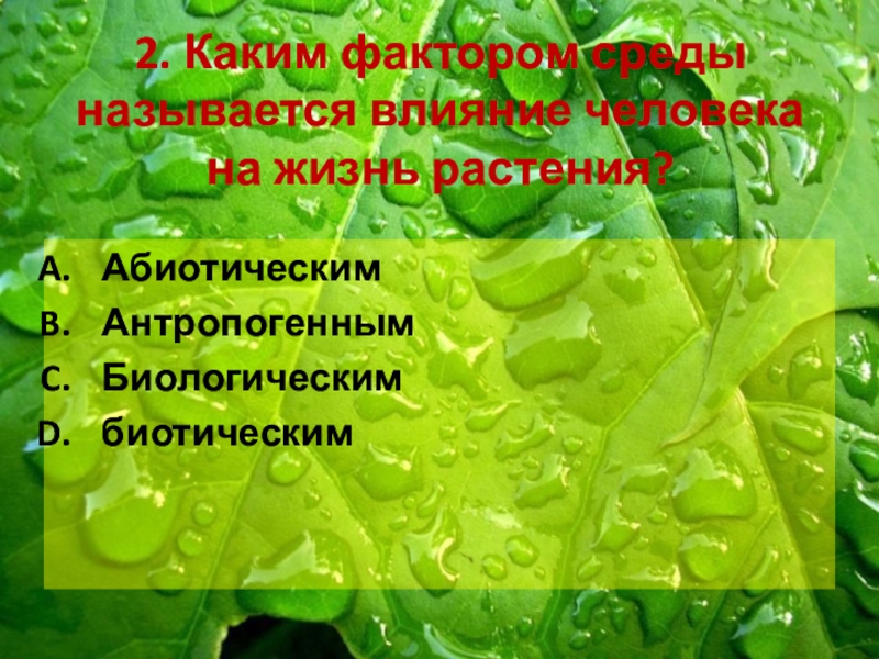 2. Каким фактором среды называется влияние человека на жизнь растения?АбиотическимАнтропогеннымБиологическимбиотическим