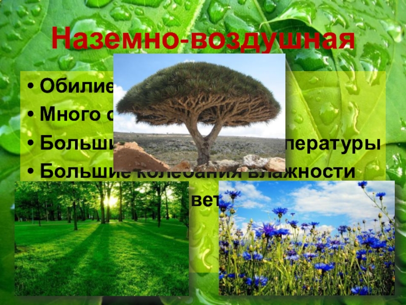 Наземно-воздушнаяОбилие воздухаМного светаБольшие колебания температурыБольшие колебания влажностиБольшая роль ветра