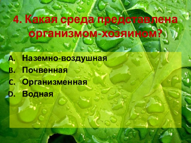 4. Какая среда представлена организмом-хозяином?Наземно-воздушнаяПочвеннаяОрганизменнаяВодная