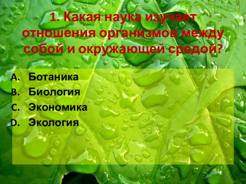 Слайд 91. Какая наука изучает отношения организмов между собой и окружающей средой?